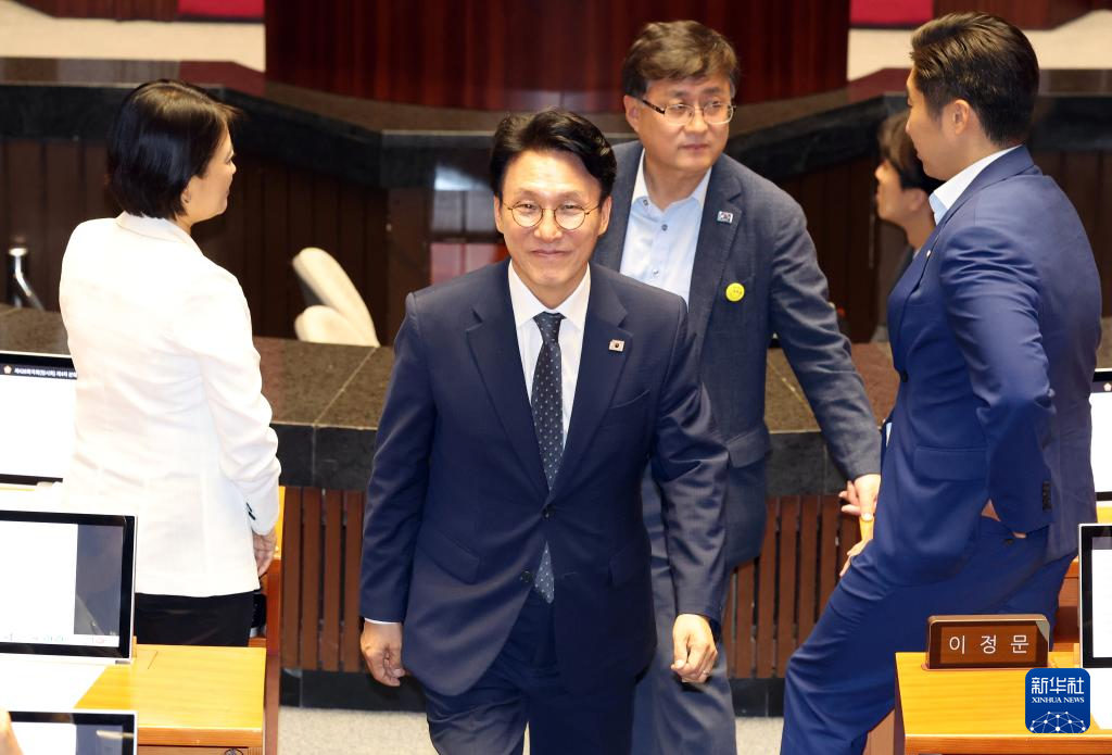 7月3日,在韩国首尔,金民锡(前)在韩国国会参加会议。