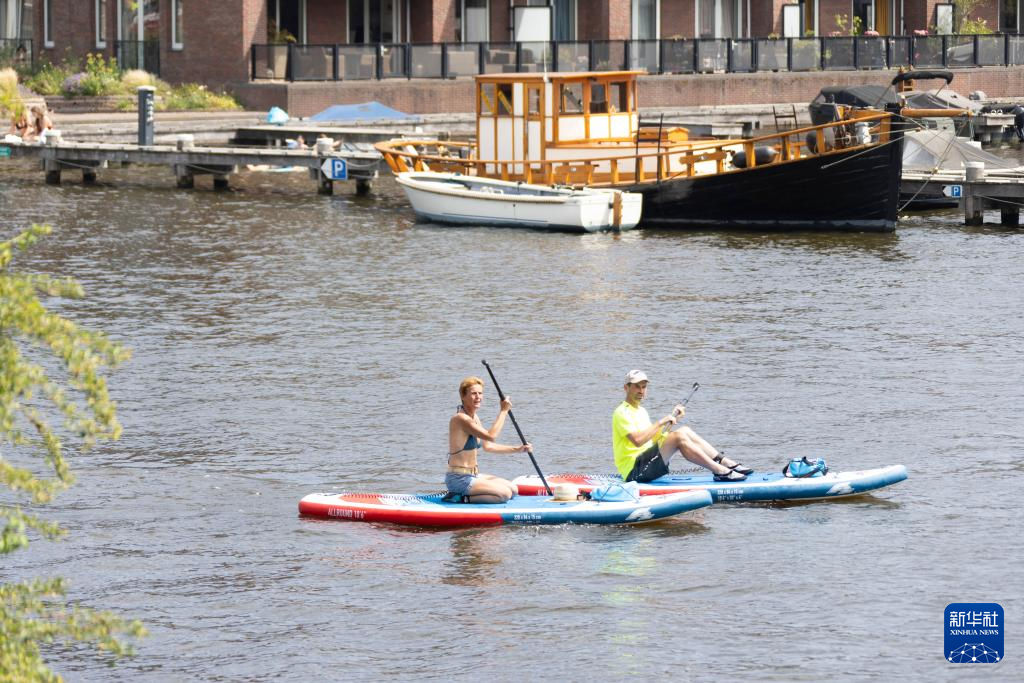 7月2日,在荷兰哈勒姆,人们在斯帕尔内河上划桨板。