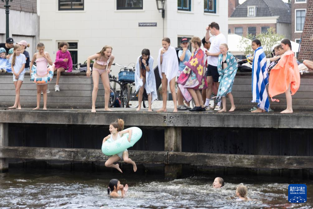 7月2日,在荷兰哈勒姆,孩子们跳水纳凉。