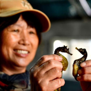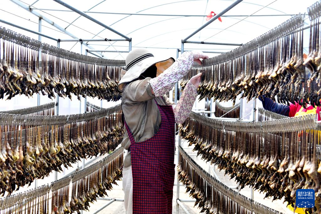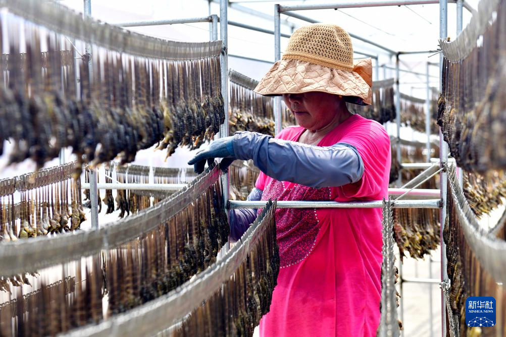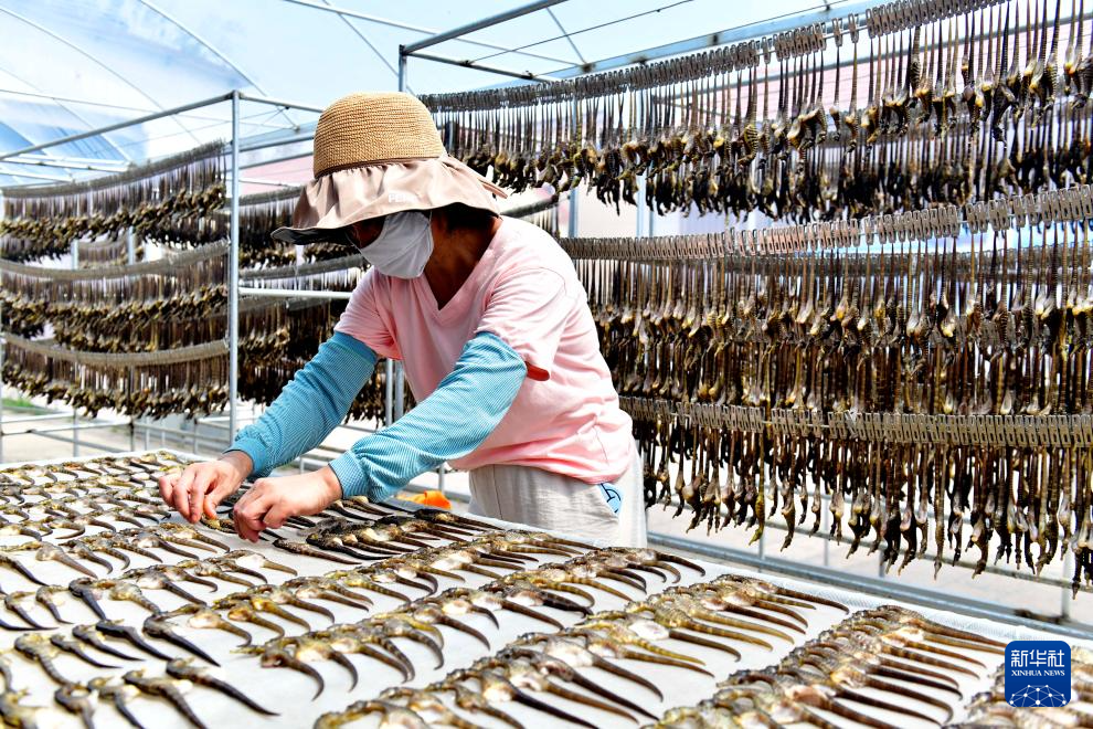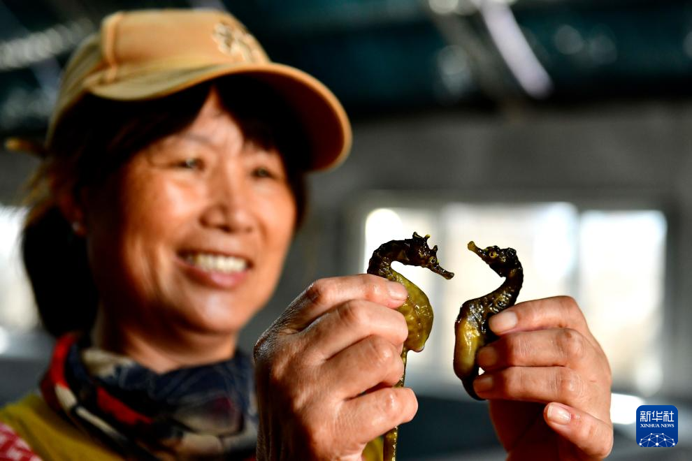 7月4日,在日照市东港区涛雒镇膨腹海马养殖基地,工作人员在晾晒膨腹海马。