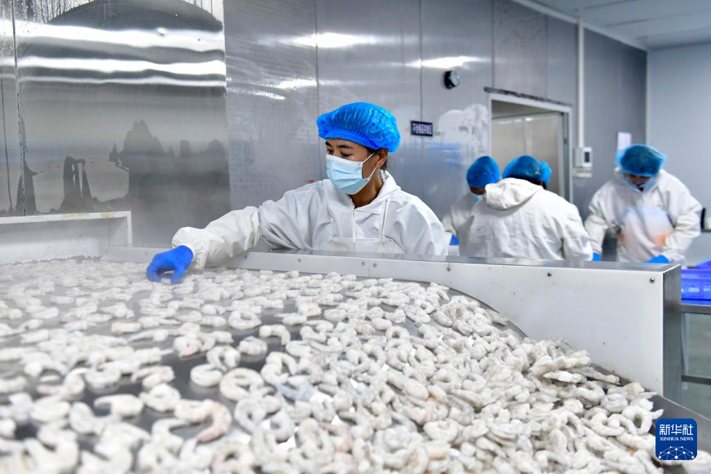 7月4日,在日照市东港区涛雒镇一家水产品加工企业,工作人员在速冻生产线忙碌。