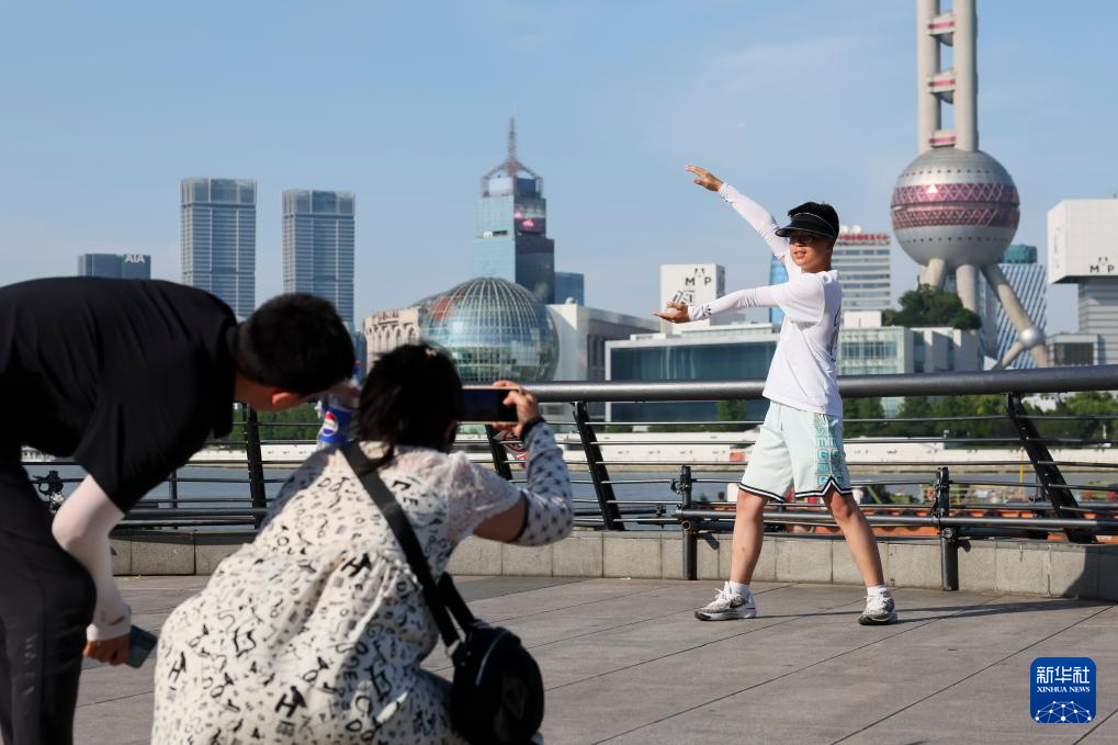 7月4日,游客戴遮阳帽在外滩打卡留影。