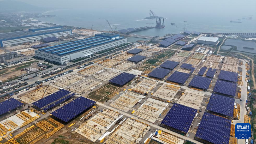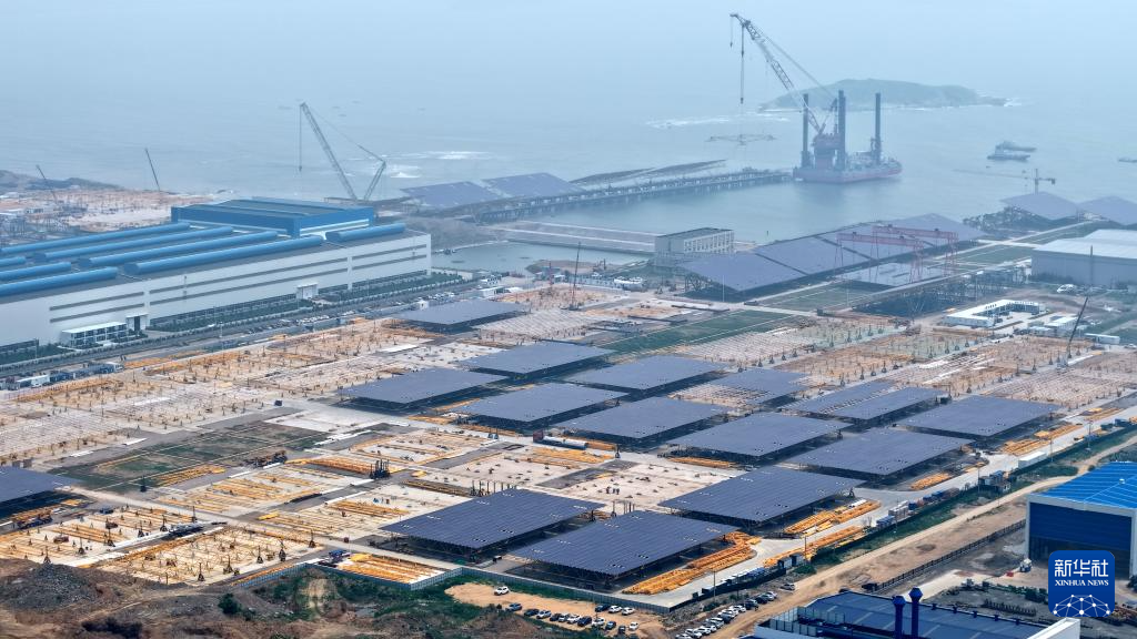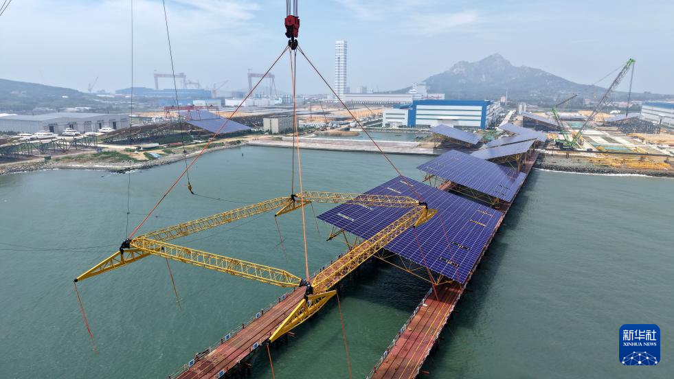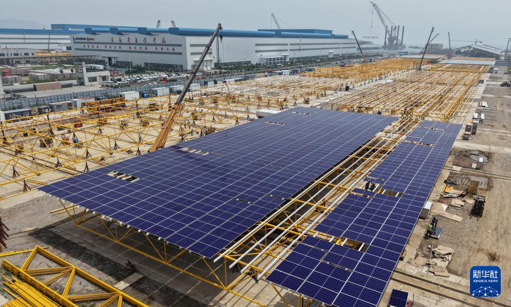 在青岛即墨海上光伏项目光伏平台组装场区,一榀正在组装中的光伏平台由1380 块光伏板和支架组成(7月3日摄,无人机照片)。