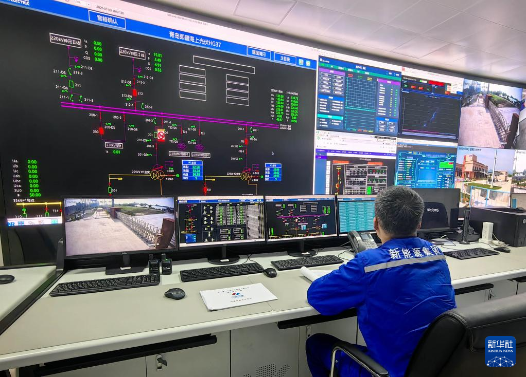7月3日,工作人员在中电建青岛即墨海上光伏项目陆上升压站控制中心值守。