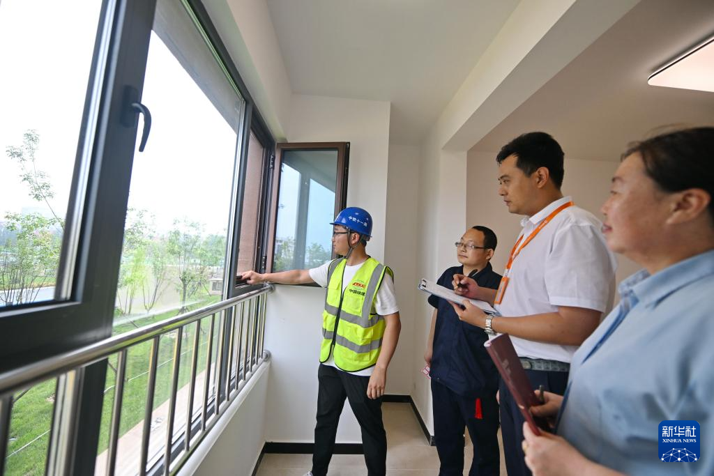 7月3日,中铁十一局集团工作人员在保定市城中村改造小营坊安置区新建楼房内向物业工作人员及业主介绍窗户质量情况。