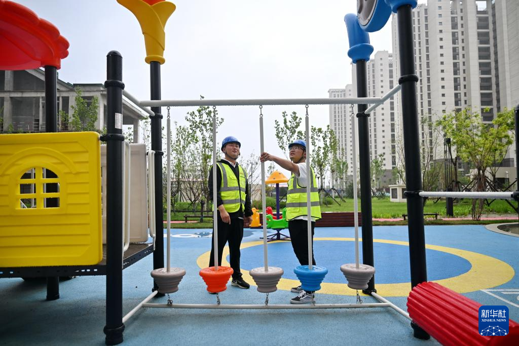 7月3日,中铁十一局集团工作人员在保定市城中村改造小营坊安置区内检查儿童游乐场器械质量。