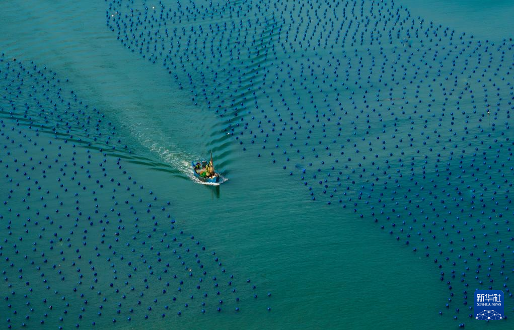 在连江县黄岐半岛海域海洋牧场里,海面波光粼粼,光影下的浮球层层叠叠,织就一幅美丽画卷(7月3日摄,无人机照片)。
