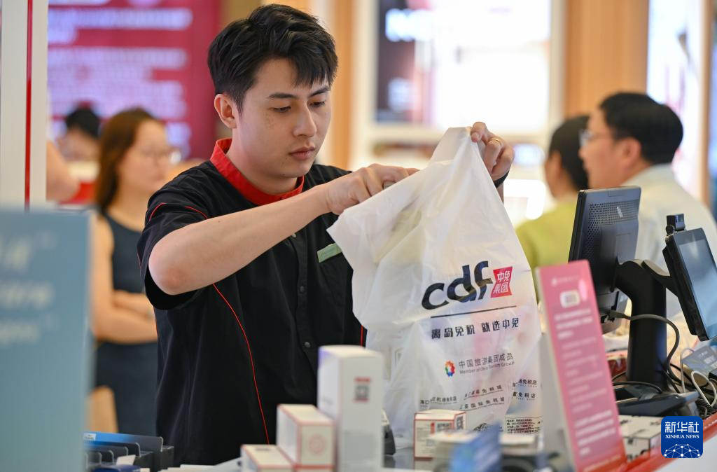7月5日,海口日月广场免税店的工作人员在打包免税品。