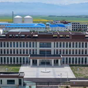 这是7月4日拍摄的由江苏泰州援疆支持修建的昭苏县中小微企业创业孵化中心(无人机照片)。该中心预计在本月投入使用。