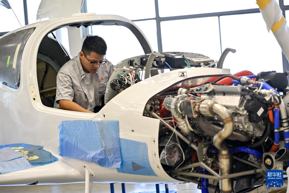 7月3日,在位于安徽省芜湖市湾沚区的中电科芜湖钻石飞机制造有限公司内,工作人员在装配一架通航飞机。