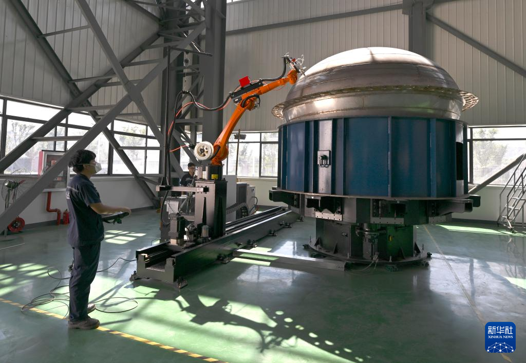 7月3日,在位于安徽省蚌埠市的深蓝太空航天科技(蚌埠)有限公司,焊接机器人在对火箭燃料贮箱箱底进行焊接。