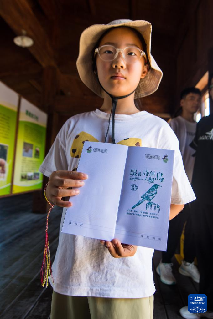 7月5日,小游客展示自己在杭州湾国家湿地公园内参与观鸟活动时收集的印章。