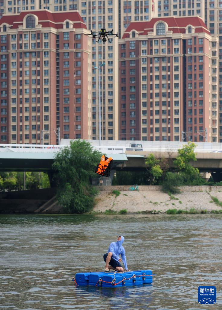 7月5日,救援人员演练利用无人机运送救生衣给水面被困人员。