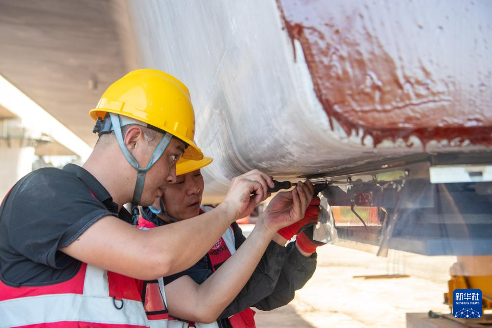 7月5日,工人在渝万高铁江林村特大桥架梁施工现场作业。