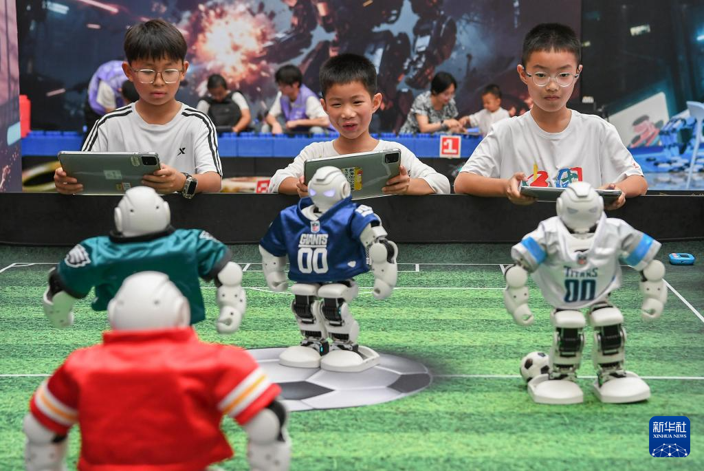 7月6日,浙江省金华市金华之光文化广场科技馆内,小朋友在体验足球机器人。