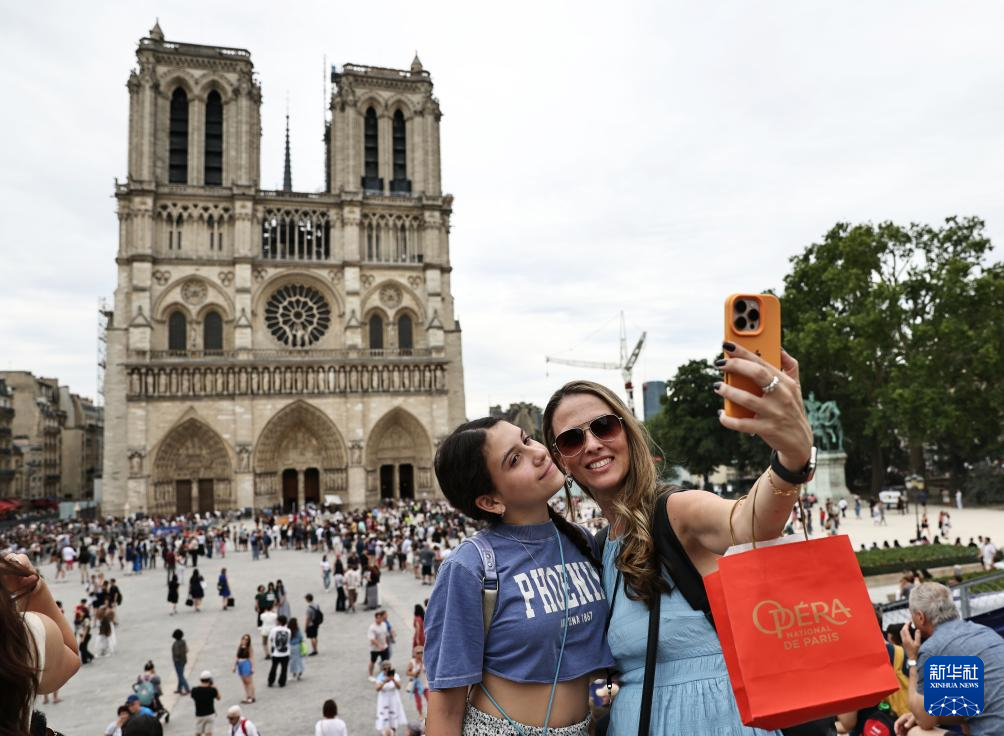 7月5日,两名女子在法国巴黎圣母院前自拍。
