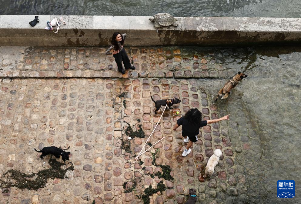 7月5日,人们在法国巴黎塞纳河边遛狗。