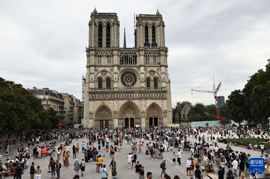 7月5日,人们在法国巴黎圣母院前游览。