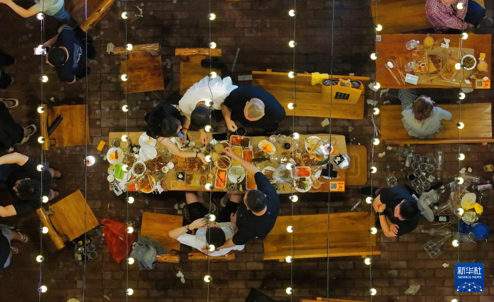 7月5日,在第二十三届哈尔滨国际啤酒节现场,游客在啤酒花园里喝啤酒品美食(无人机照片)。