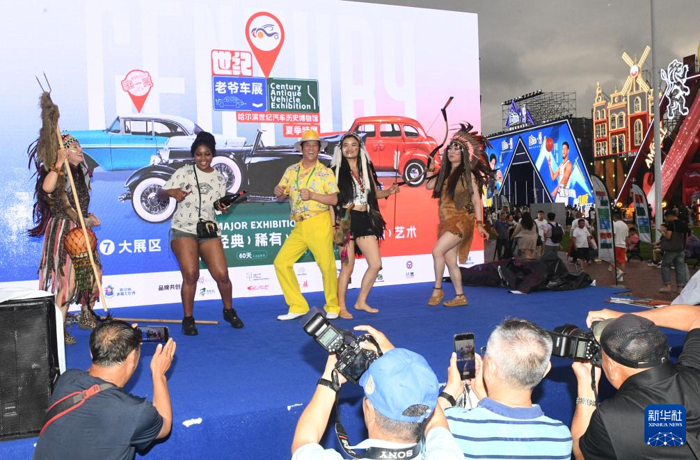 7月5日,在第二十三届哈尔滨国际啤酒节现场,游客在观赏世纪老爷车展舞台上的表演。