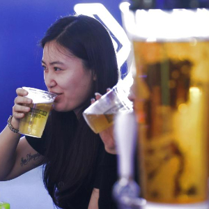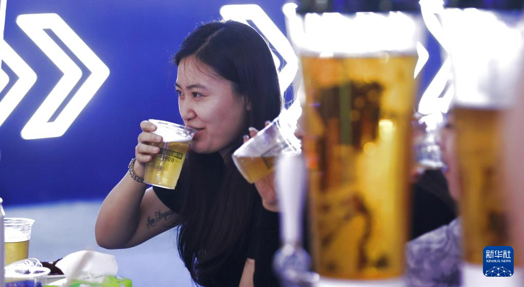 7月5日,在第二十三届哈尔滨国际啤酒节现场,游客在啤酒大篷畅饮。