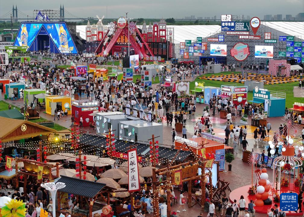7月5日,在第二十三届哈尔滨国际啤酒节现场,游客在各个啤酒大篷、啤酒花园、啤酒自助区打卡(无人机照片)。