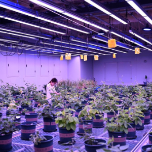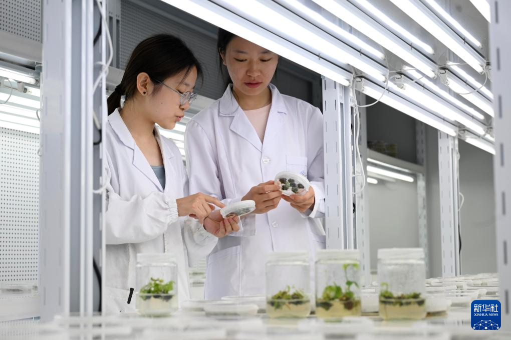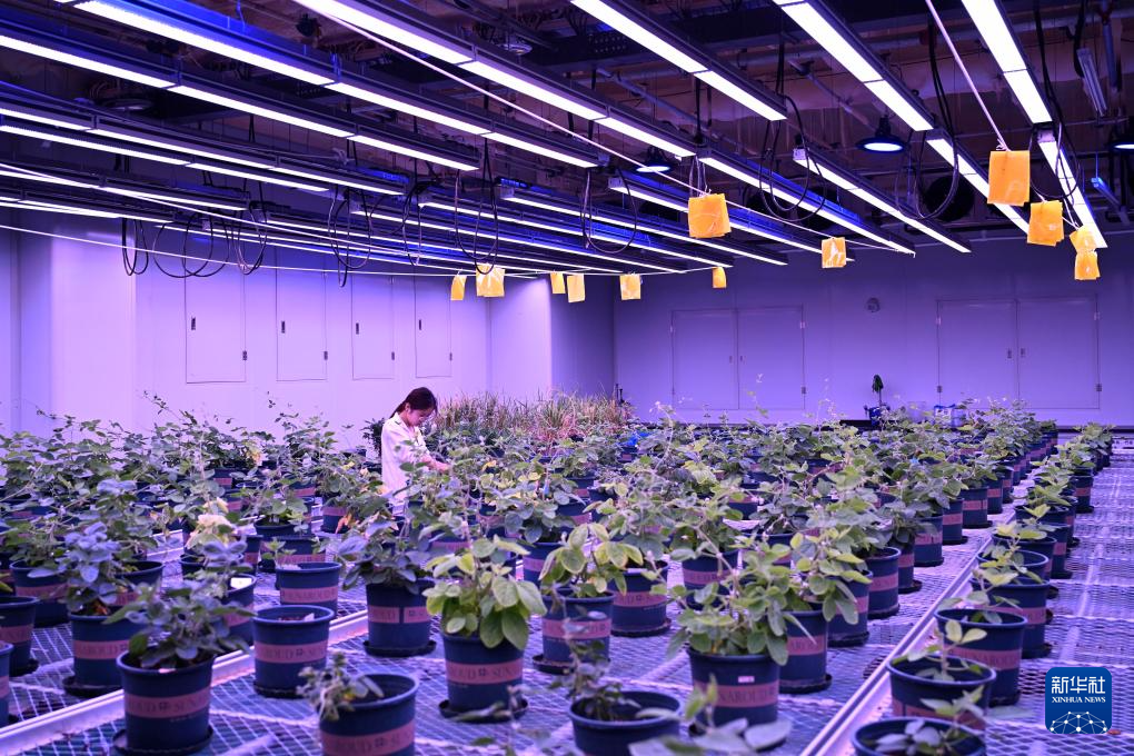 7月6日,研究人员在黄淮海(宿州)种业科技谷南京农业大学大豆生物育种中心人工气候室观察育种材料生长情况。
