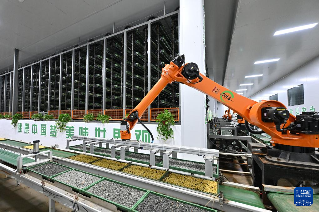 这是河北省阜平县豆致富土培芽苗菜植物工厂的自动化立体种植生产线(7月4日摄)。