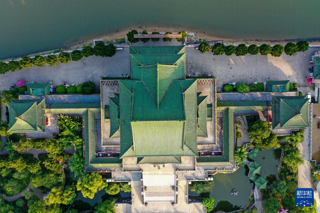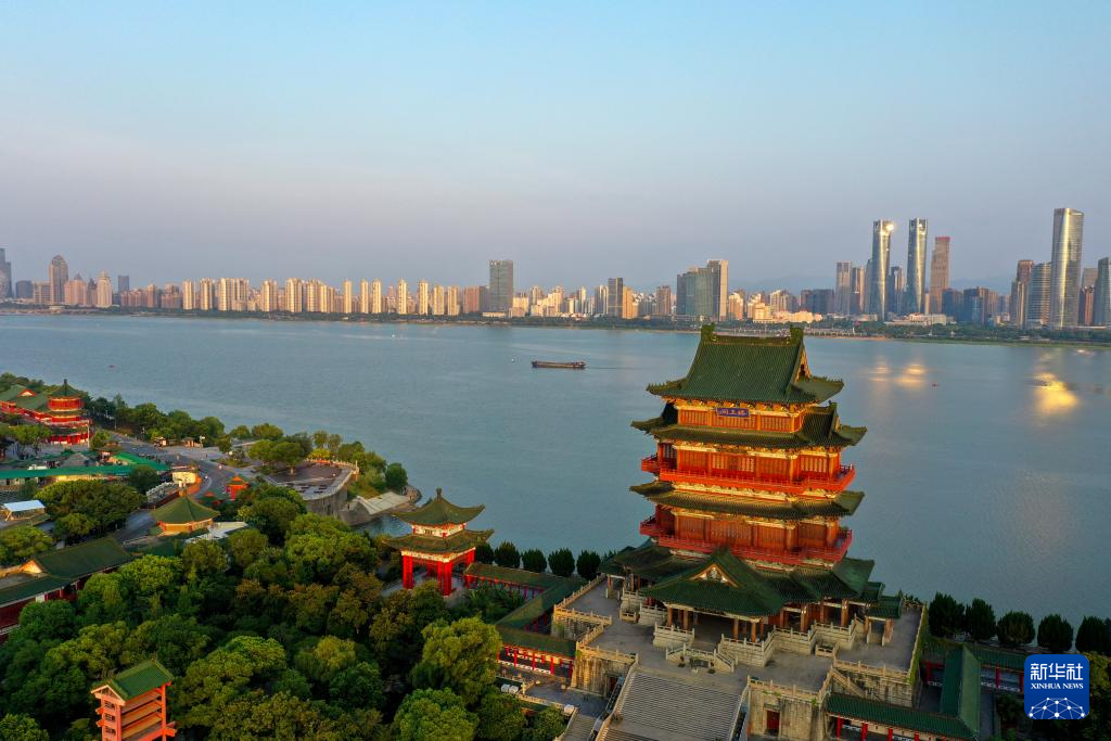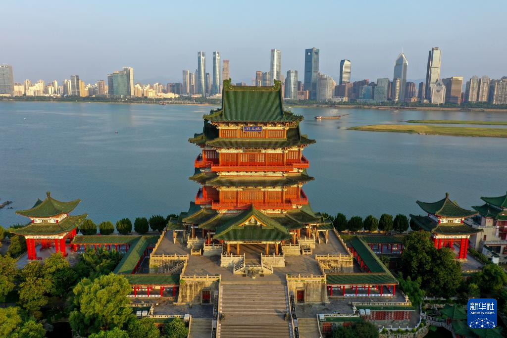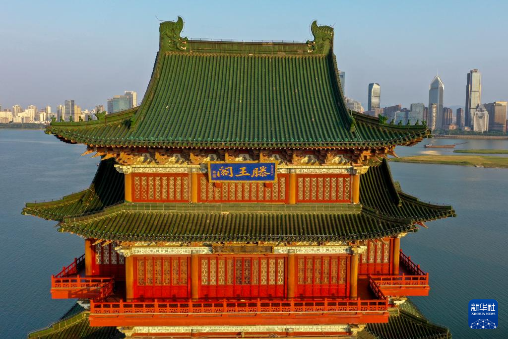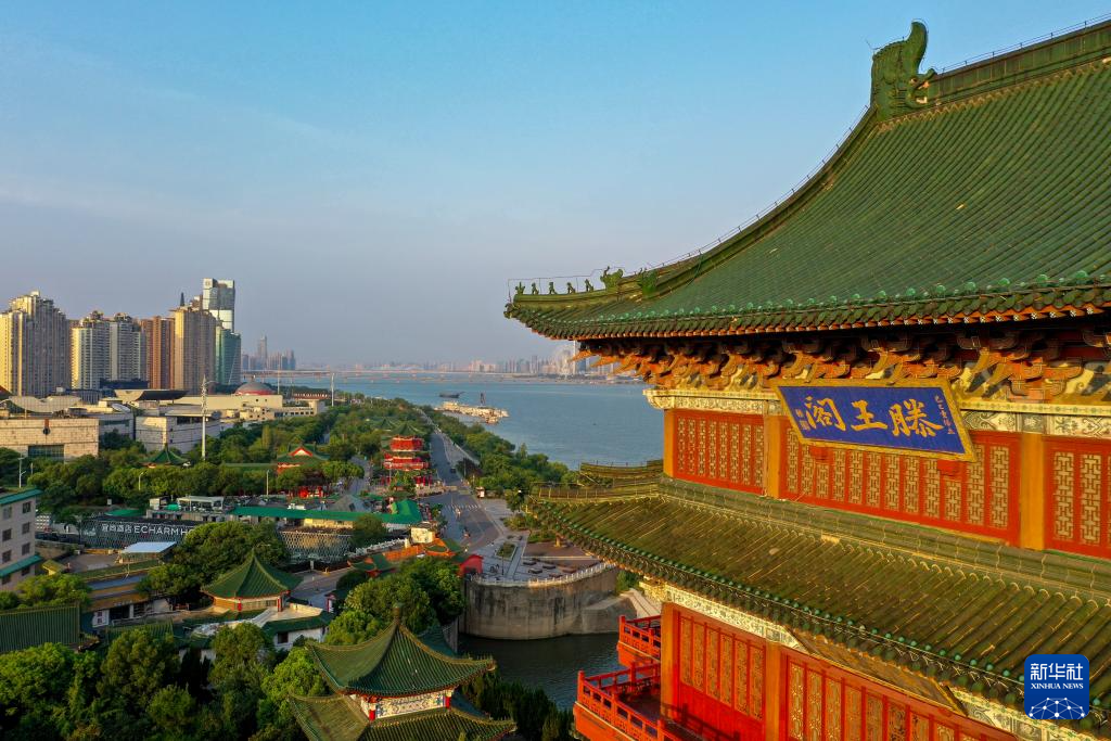 晨光中的江西南昌滕王阁景区(7月7日摄,无人机照片)。