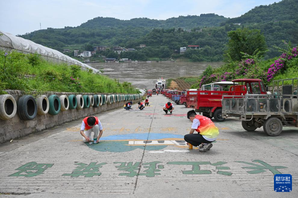 7月7日,志愿者在巴南区中坝岛绘制创意图案。