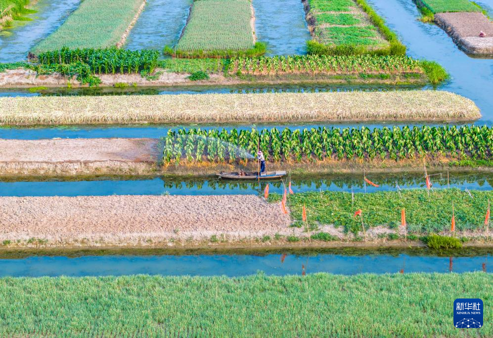 7月7日,农民在江苏省兴化市垛田街道高家荡村田间浇水(无人机照片)。