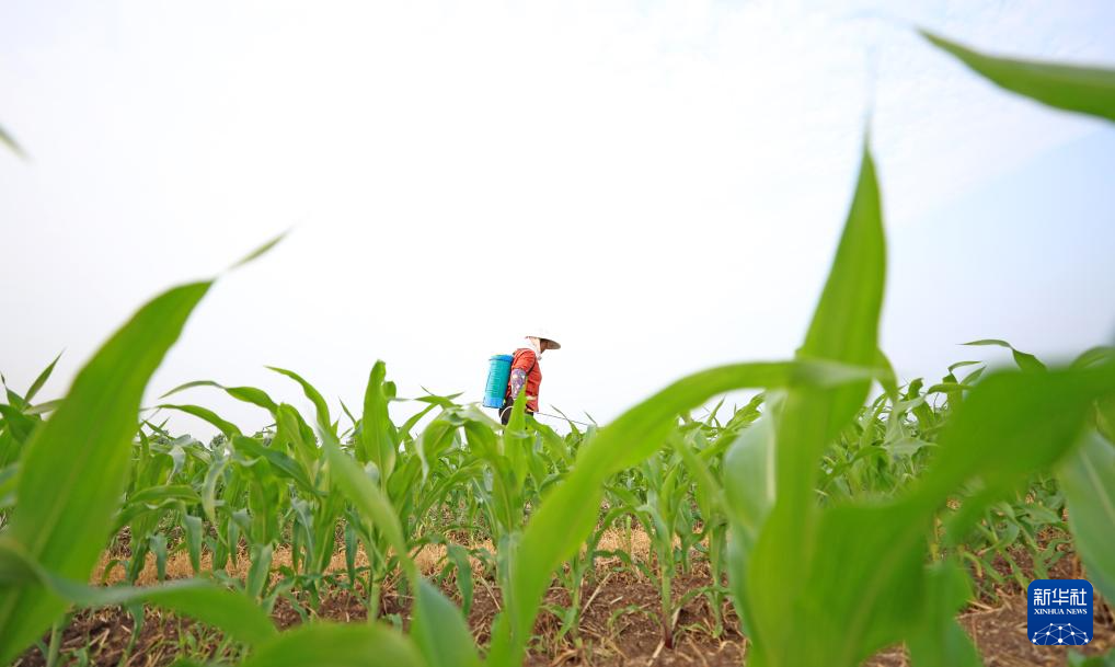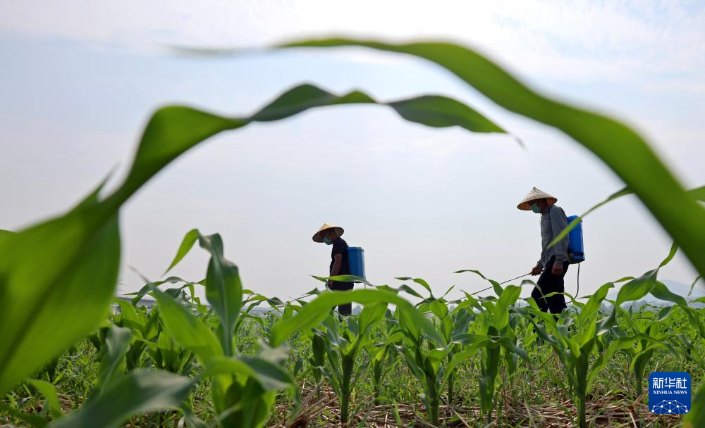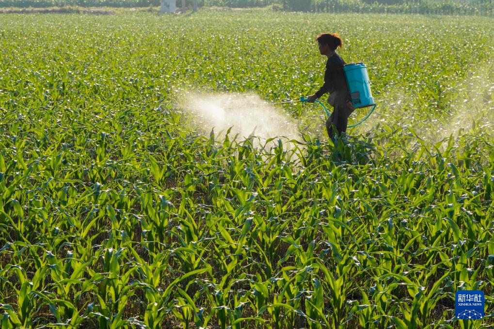 7月7日,山东省枣庄市市中区西王庄镇付刘耀村农民在玉米田喷洒除草剂。
