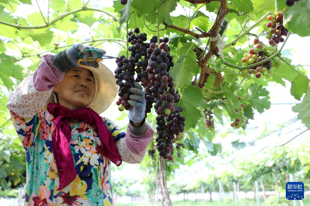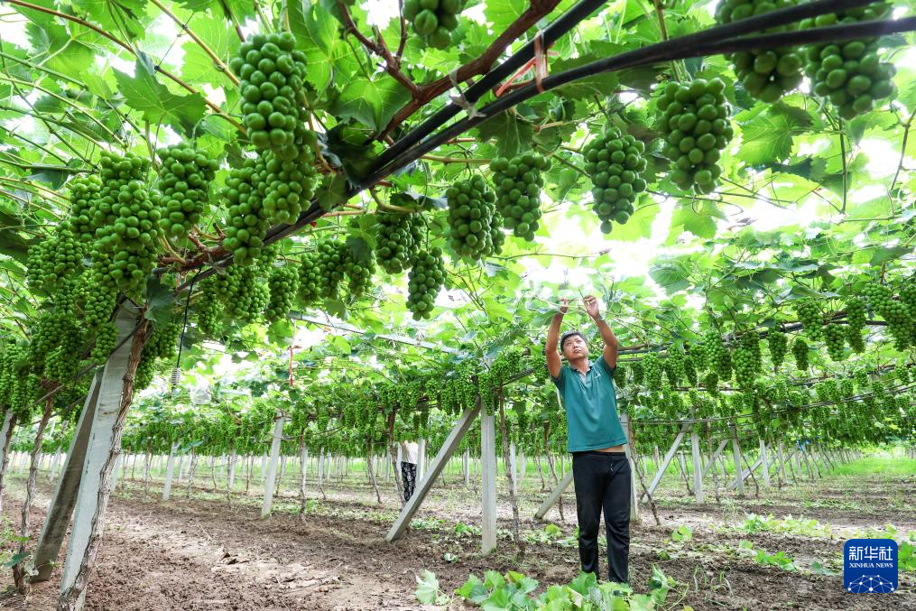7月7日,农民在山东省滨州市博兴县庞家镇优质葡萄智慧农业产业园管护葡萄。