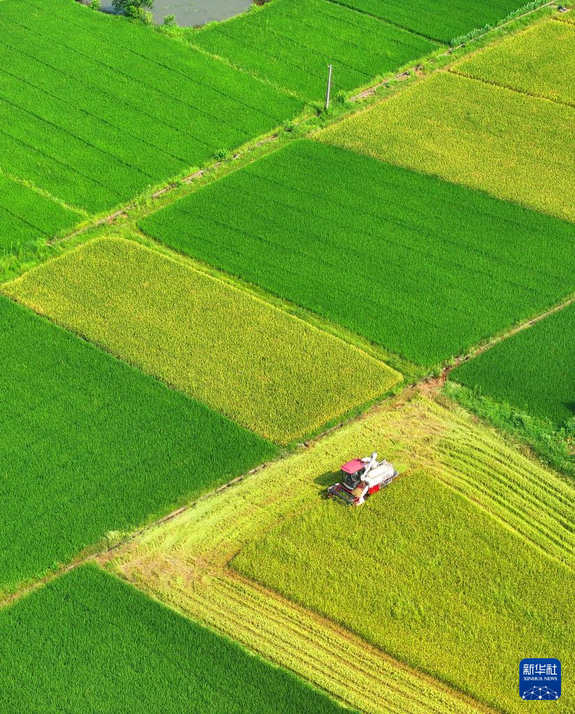 7月7日,湖南省衡阳市衡阳县台源镇村民驾驶收割机收割早稻(无人机照片)。