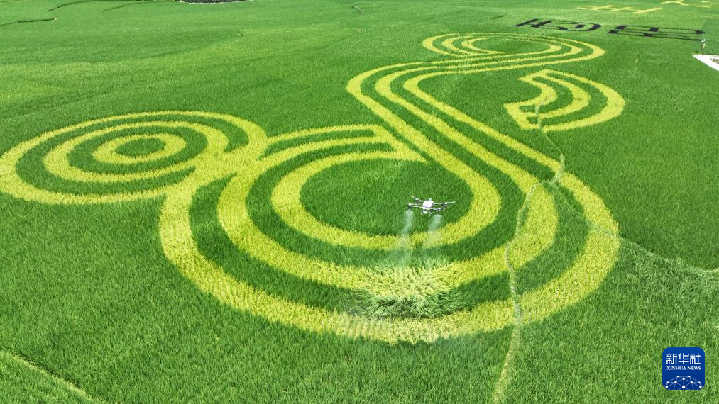 7月7日,重庆市酉阳土家族苗族自治县李溪镇让坪村连片绿色高质高效水稻基地,村民利用无人机开展水稻“飞防”作业(无人机照片)。