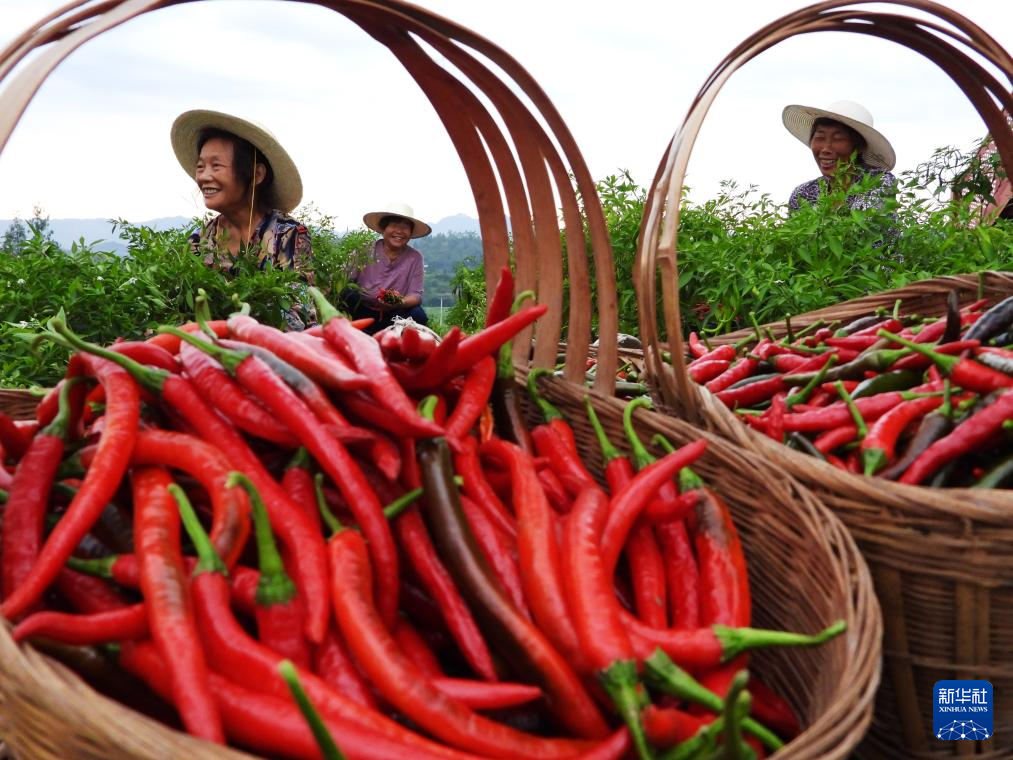 7月7日,在四川省达州市麻柳镇梁家坝村一种植基地,村民采摘有机红辣椒。
