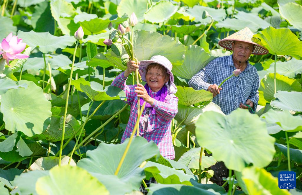 7月7日,江苏省海安市雅周镇许家庄村村民在莲藕池里采摘莲蓬。