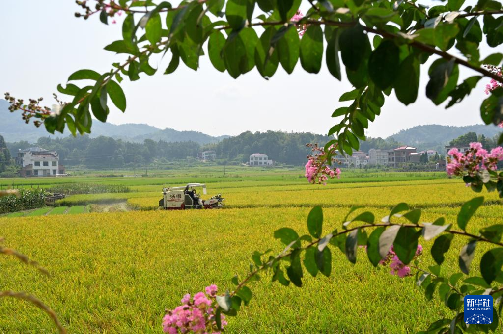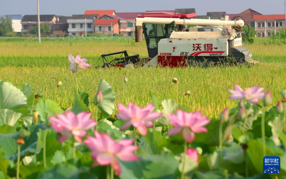 7月7日,湖南省娄底市双峰县荷叶镇石林村,农民驾驶收割机收割早稻。