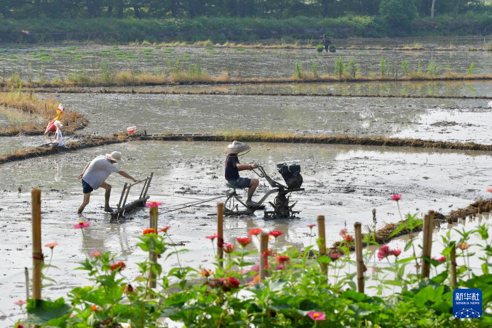 7月7日,湖南省娄底市双峰县井字镇花桥村,农民驾驶微耕机平整水田,准备栽插晚稻。