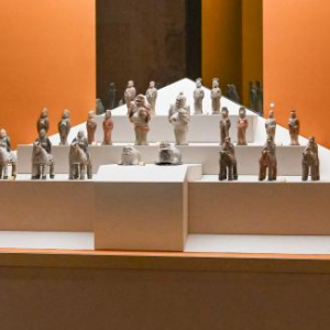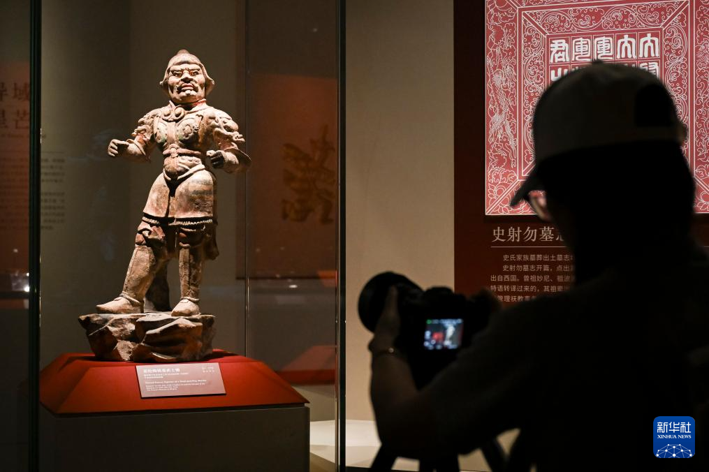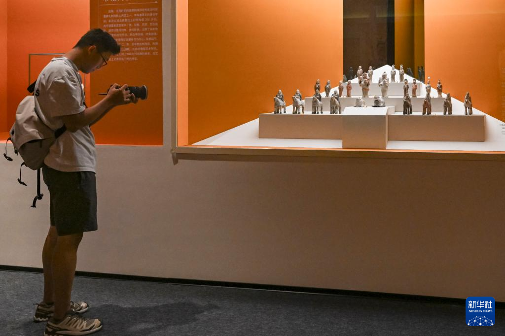 7月8日,媒体人员在“宁夏固原文物精品展”上拍摄展品彩绘陶俑群。