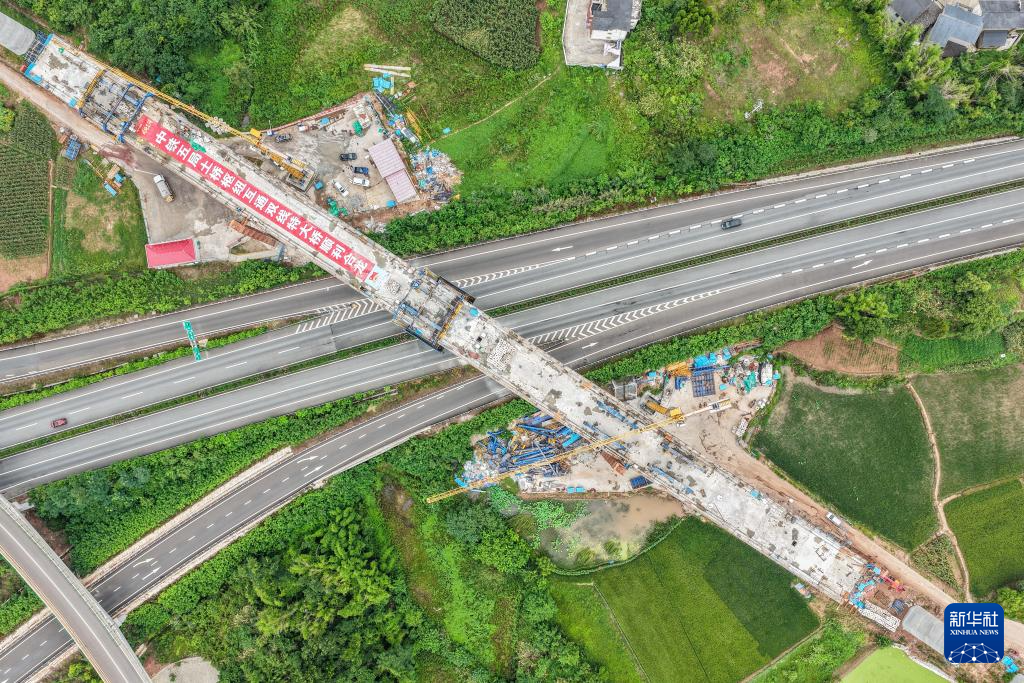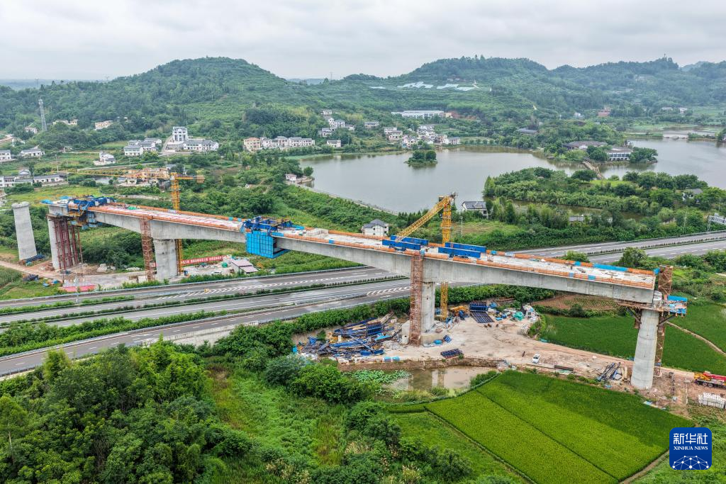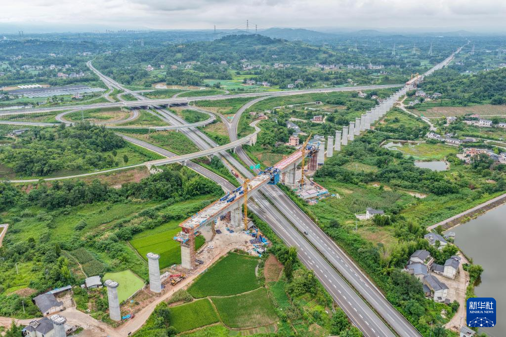 这是7月8日拍摄的成渝中线高铁土桥枢纽互通双线特大桥建设现场(无人机照片)。