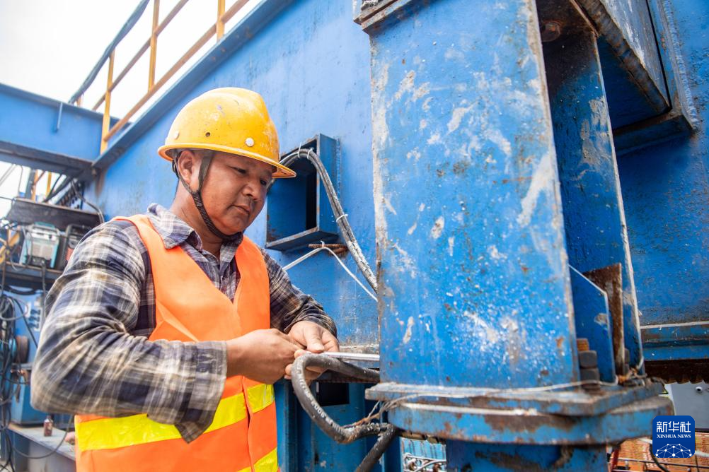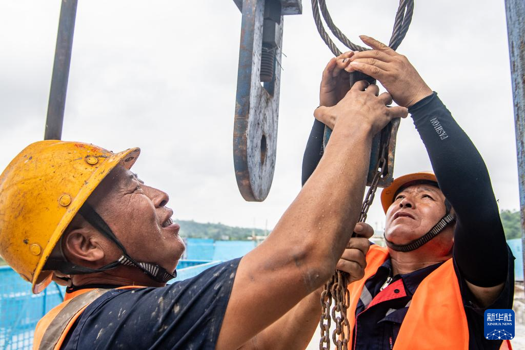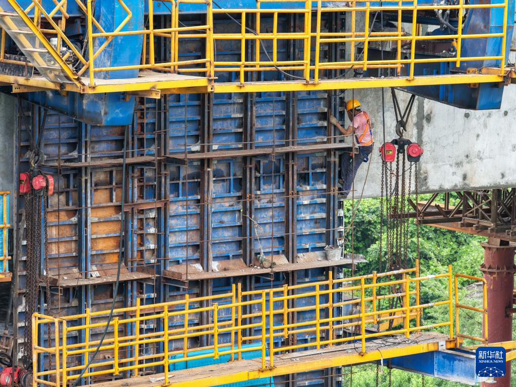 7月8日,工人在成渝中线高铁土桥枢纽互通双线特大桥建设现场施工作业。