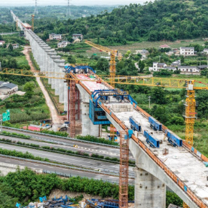 当日,由中铁五局承建的成渝中线高铁土桥枢纽互通双线特大桥连续梁顺利合龙,该连续梁全长约242米,是成渝中线高铁重庆段跨度最大的连续梁。土桥枢纽互通双线特大桥位于重庆市铜梁区,全长3271.6米,上跨重庆三环高速及铜安高速公路,共设有92个桥墩,2个桥台。