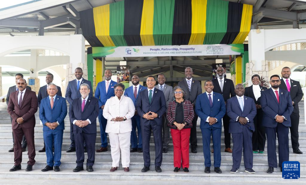 7月7日,在牙买加蒙特哥贝市,加勒比共同体第49届政府首脑会议与会代表合影留念。