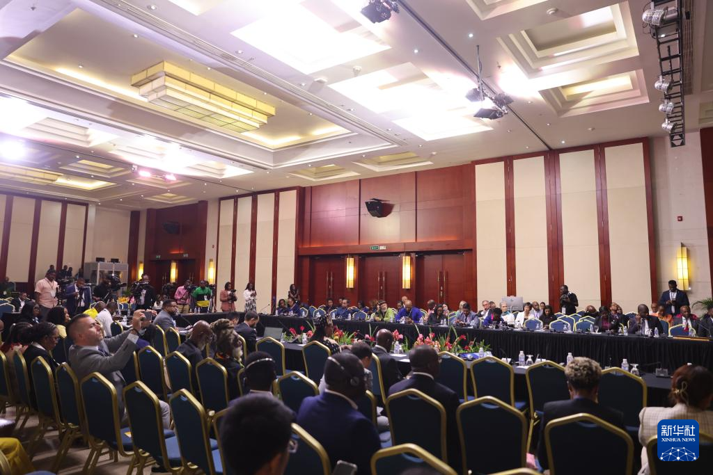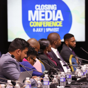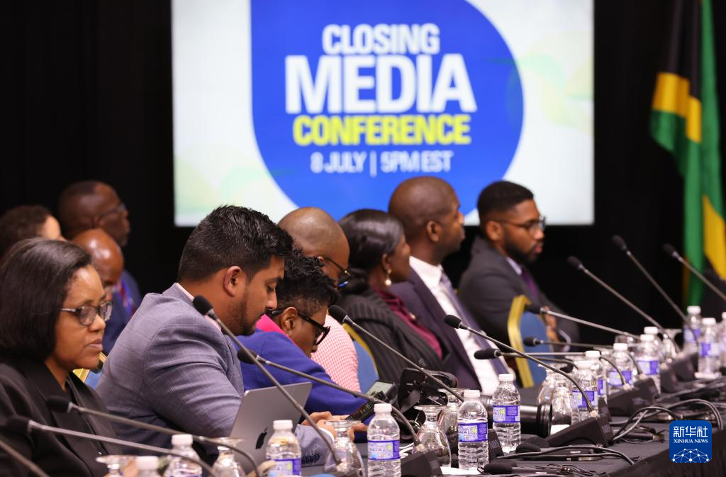 7月8日,在牙买加蒙特哥贝市,参会者在闭幕式新闻发布会上。