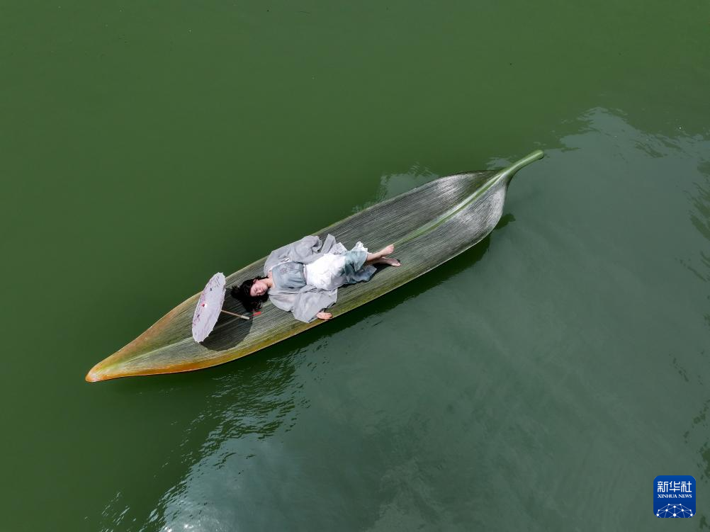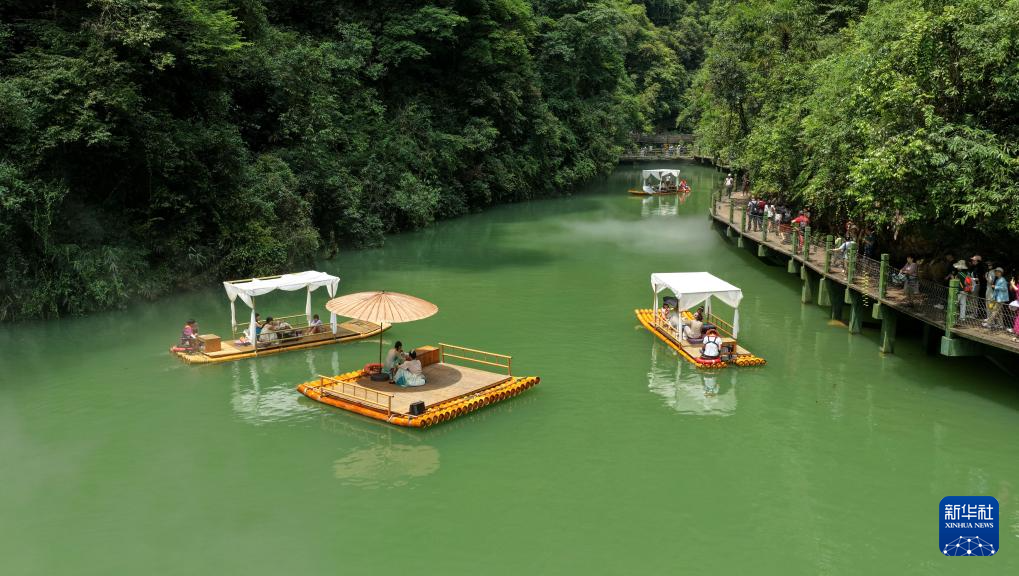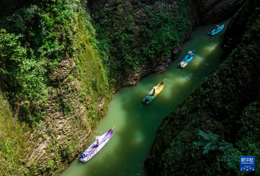 7月9日,游客在鹤峰县屏山峡谷体验游船项目(无人机照片)。