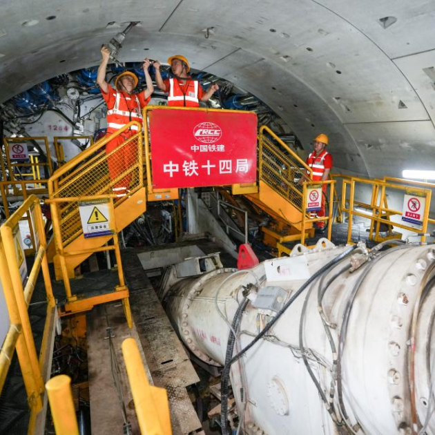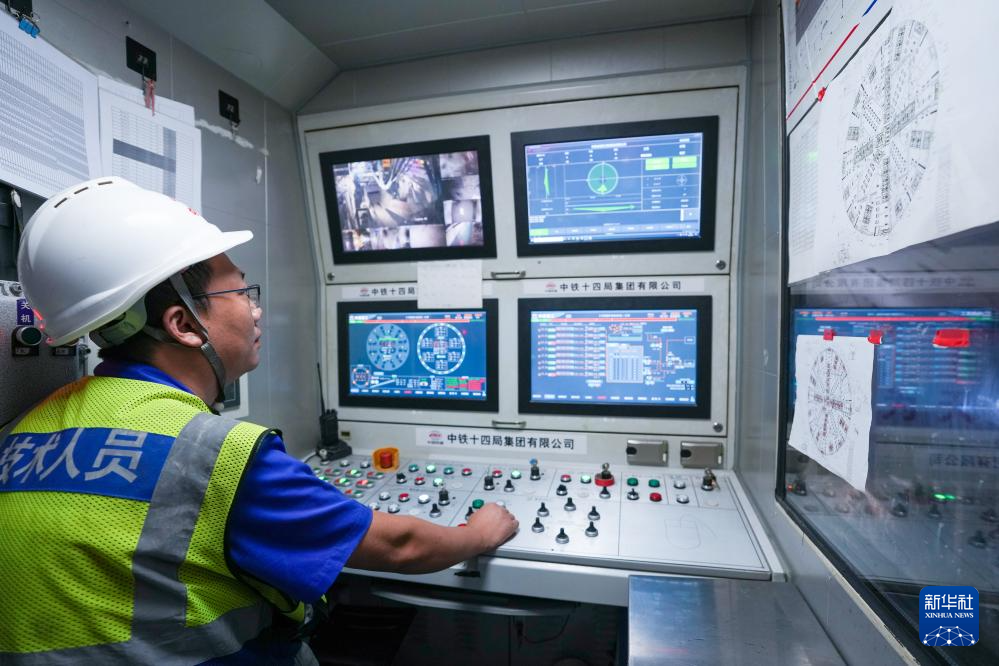 7月9日,中铁十四局的施工人员在施工现场查看盾构机作业情况。