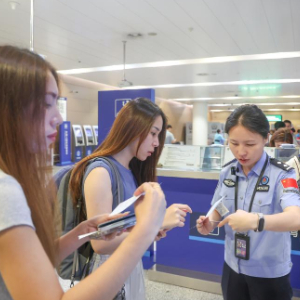 7月8日,在重庆江北国际机场,重庆出入境边防检查总站民警解答入境旅客疑问。