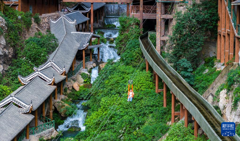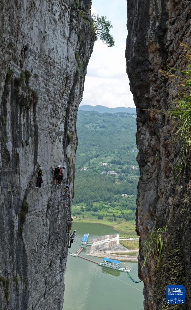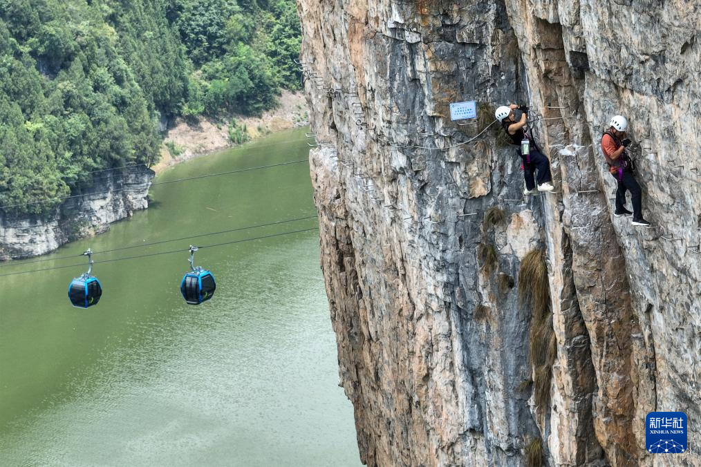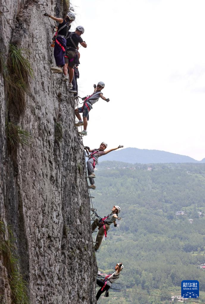 7月8日,在湖北省恩施市新塘乡红花峰林景区,游客在体验“飞拉达”攀岩项目。