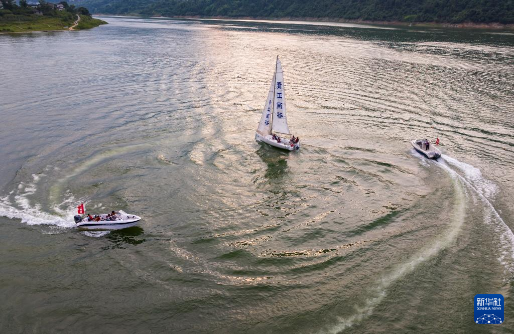 7月7日,游客在湖北省建始县清江水语小镇水上运动中心体验水上运动项目(无人机照片)。